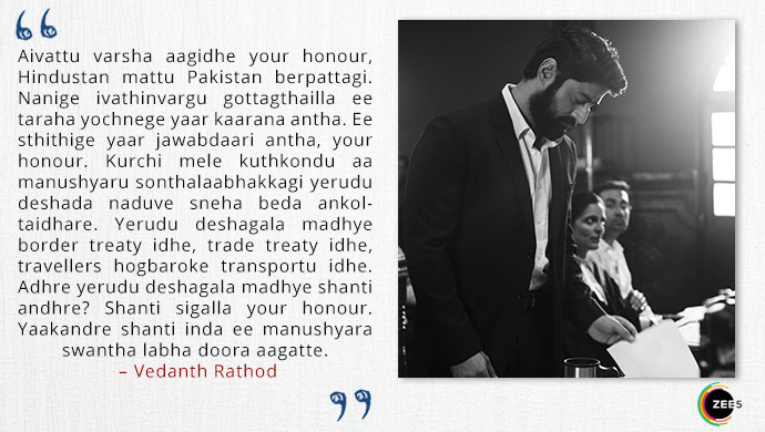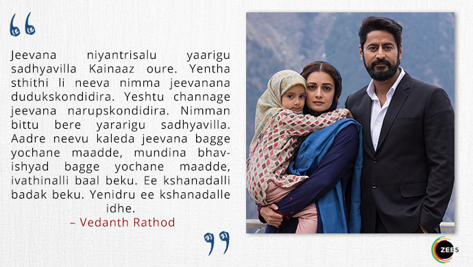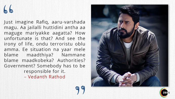 While waiting for his first interview with Kainaaz Akhtar, Vedanth tells his colleague Rafiq about the thing that has caught his attention. “Just imagine Rafiq, aaru-varshada magu. Aa jailalli huttidini antha aa maguge mariyakke aagatta? How unfortunate is that? And see the irony of life, ondu terroristu oblu amma. Ee situation na yaar mele blame maadthiya? Nammane blame maadkobeka? Authorities? Government? Somebody has to be responsible for it.”